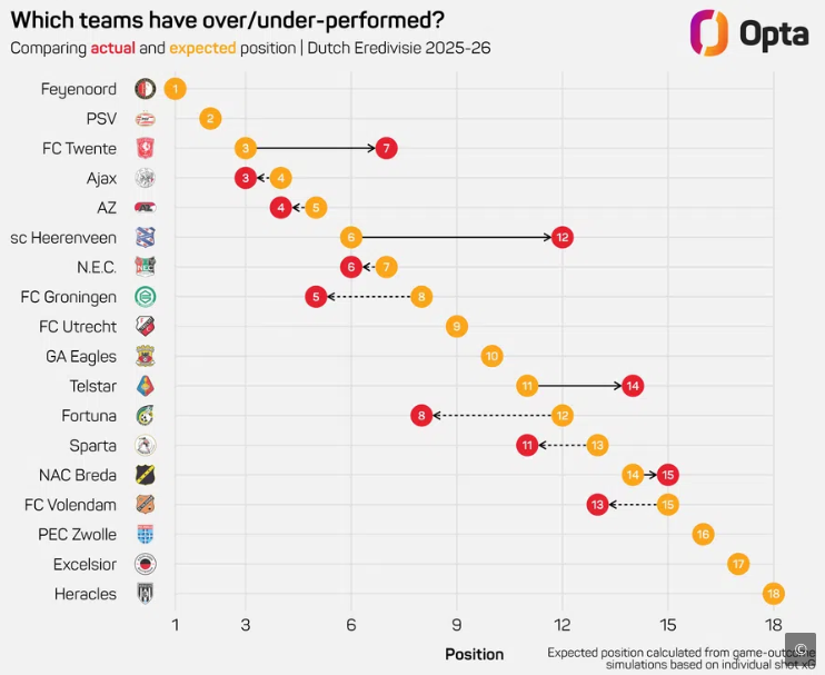 Volgens de data van Opta zou FC Utrecht - op basis van de Expected Points - nu 10,8 punten moeten hebben. De Domstedelingen hebben er momenteel 10 bij elkaar gespeeld, dus dat komt aardig overeen. In de ranglijst, gebaseerd op diezelfde Expected Points, zou FC Utrecht ook daadwerkelijk op de negende plaats moeten staan.
